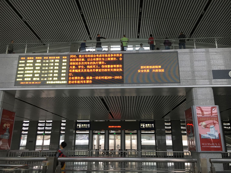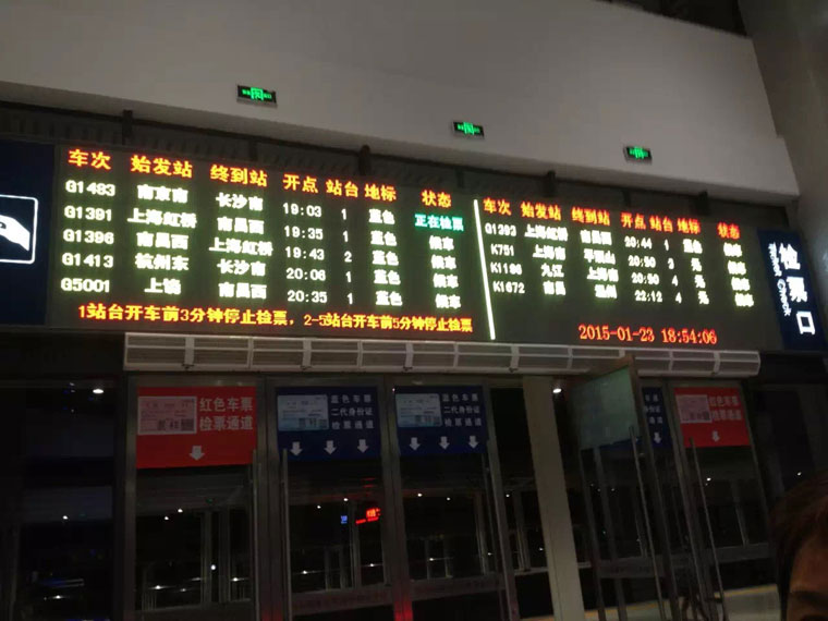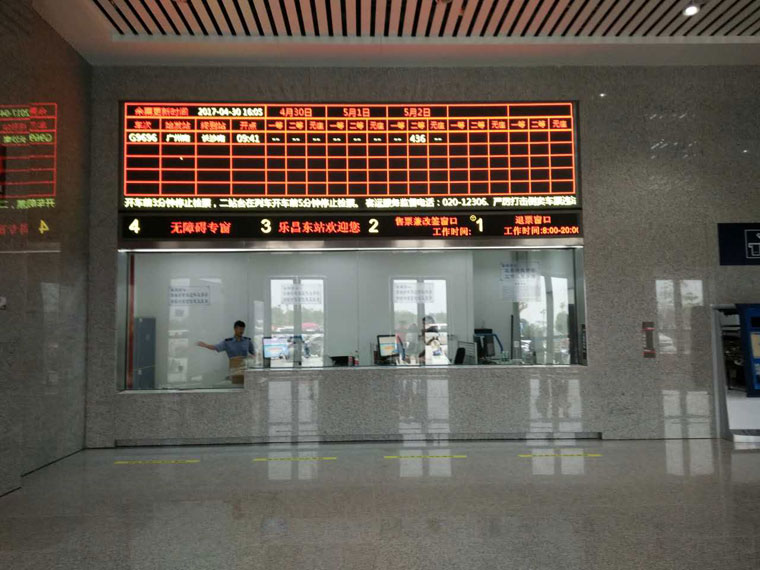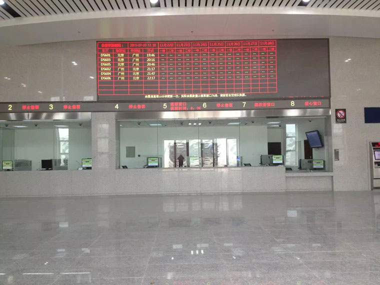 能够完成实时票务信息的发布及车次相关信息的显示,至少可显示车次信息和余票情况。设备通过内部相关系统读取票务信息,以表格、滚动、页面翻转等形式对车次、车种、开往、开点、硬座、软座、硬卧、软卧、一等座、二等座等信息进行编排、整理和显示。